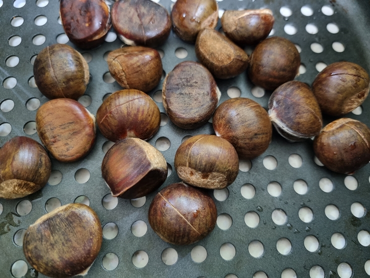 밤이 다 구워지면 껍질이 까먹기 좋게 벌어져 있어요. 껍질 까기 번거로워서 잘 안 먹게 되던 밤을 이렇게 살짝 힘만 줘도 껍질이 까지니 계속계속 손이 가네요.