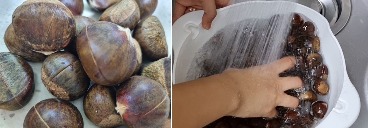 밤에 칼집이 다 나 있고 세척 되었다고 하지만 흐르는 물에 2~3번 씻어주고 키친타올로 물기를 제거해줬어요.