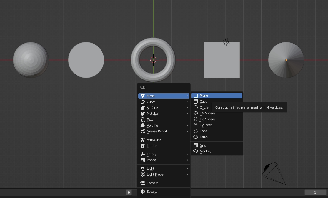 바닥면을 추가시켜줍니다. add 메뉴 Shift + A → Mesh → Plane 를 선택해줍니다.