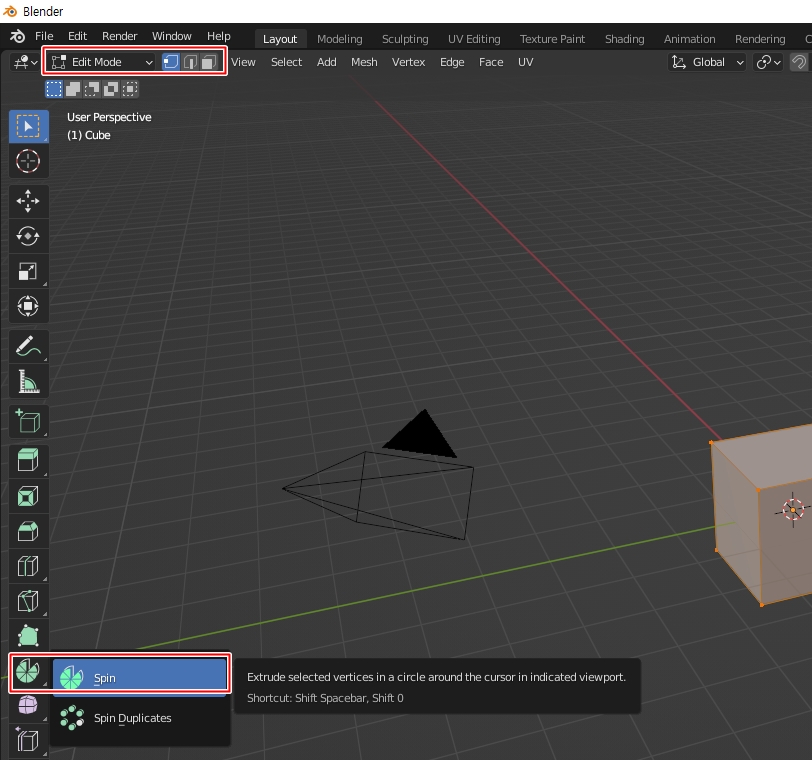 스핀은 에디터 모드(모드전환 → 탭(Tab)키) 전환 후 커서의 중심축으로 회전하면서 오브젝트를 복제하는 기능입니다.