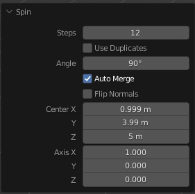 좌측 하단의 스핀 메뉴에서 Steps(회전물체의 갯수)과 Angle(각도)를 설정 할 수 있습니다.