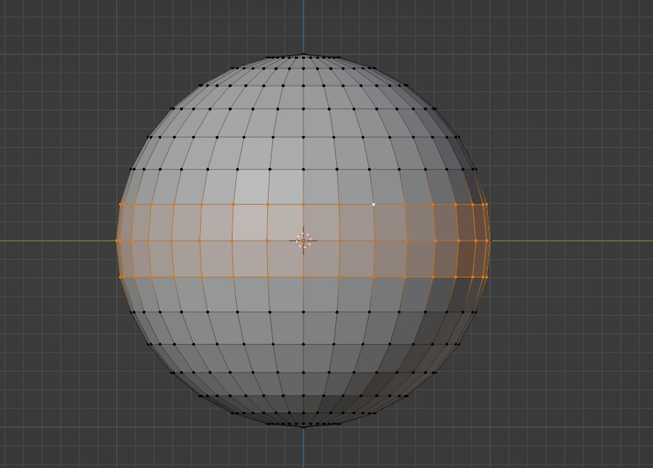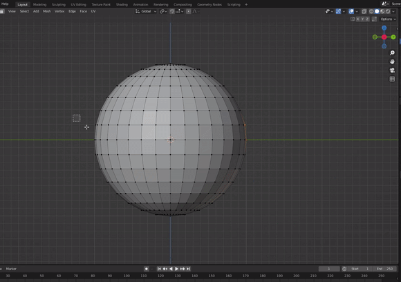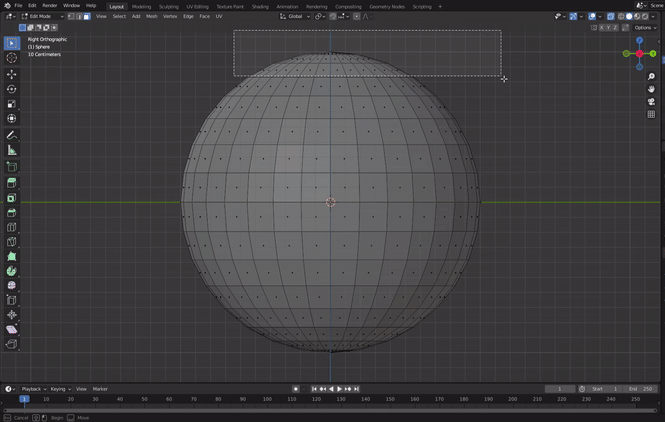아래의 구 중앙에 있는 버텍스들을 선택하고자 한다면 X레이 기능이 꺼져 있는 경우 마우스 드래그를 하게 된다면