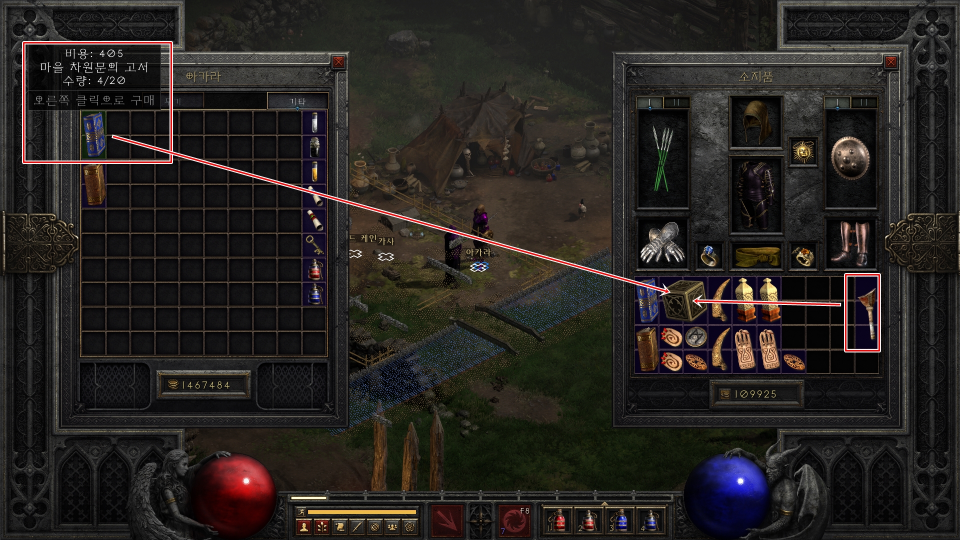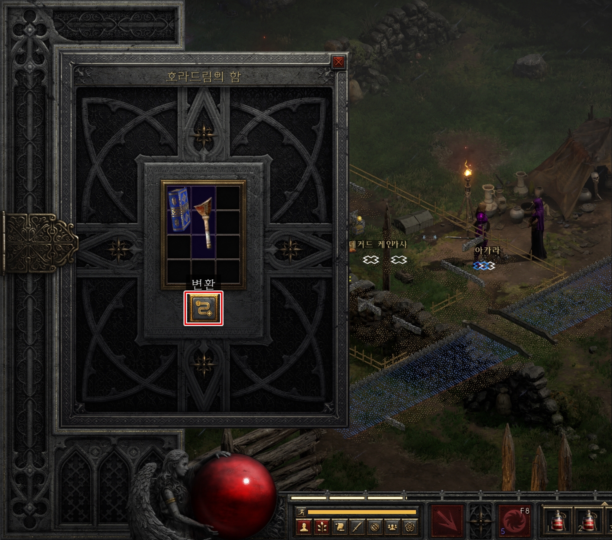 아카라에게 포탈책 한권을 구매한 뒤 챙겨온 의족을 호라드림의 함에 넣어주고 변환 버튼을 클릭하면 붉은색의