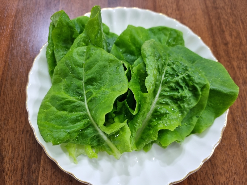 물로 한번 씻어서 접시에 담아주면 집에서 키운 상추가 식탁위에 놓여집니다ㅎ