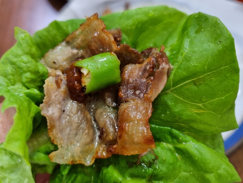 아이들이 대패삼겹을 좋아하다보니 바싹하게 구운 삼겹에 고추하나를 올리고 쌈을 싸먹어보니 정말 상추잎의 식감이 아삭아삭하니 맛있습니다.
