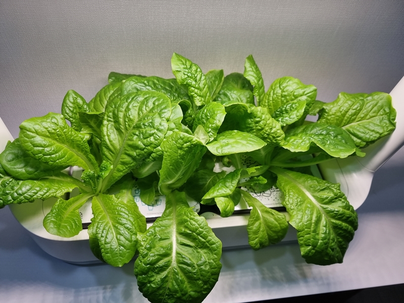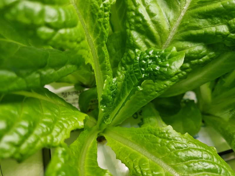 수경 재배통에 상추잎들이 빼곡히 자라나서 조명을 서로 차지 하겠다고 영역 싸움을 하는것 같네요.