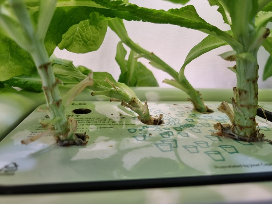 수경재배로 성장이 더딘 상추잎들이 조명에 가려 상태가 안좋아진건가? 주기적으로 물을 갈아주고 영양제를 투입한다고 하지만 좁은 재배통의 성장 한계점이 온 것 같더라구요. 파종한지는 대략 60일 정도 되는 시점입니다.