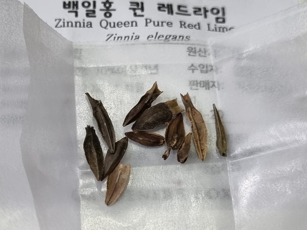 학명은 백일홍 퀸 레드라임이고 씨앗은 가늘고 길게 생겼어요. 레드라임이라고 명명된 것처럼 꽃이 피면 붉은색을 띠고 있겠죠