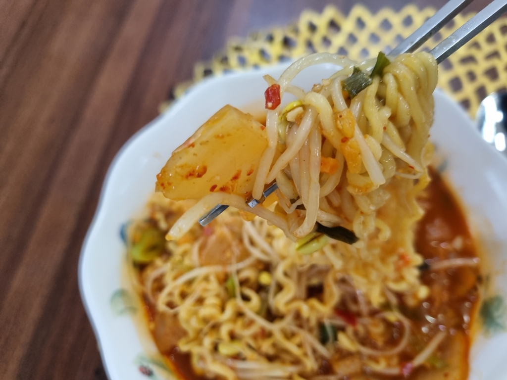 개운한 얼큰함이 살아있는 김치 콩나물 라면이네요.