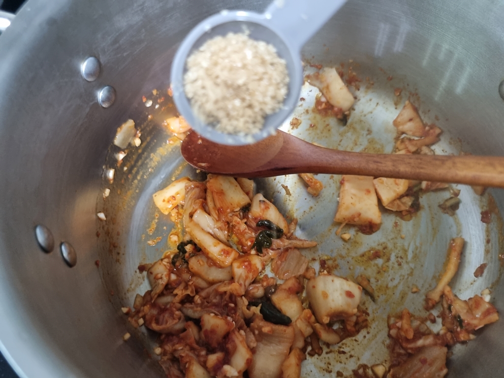 열심히 볶다보면 마늘향이 올라오는데 설탕을 1t(작은 티스푼) 넣어 김치의 신맛을 잡아줍니다.