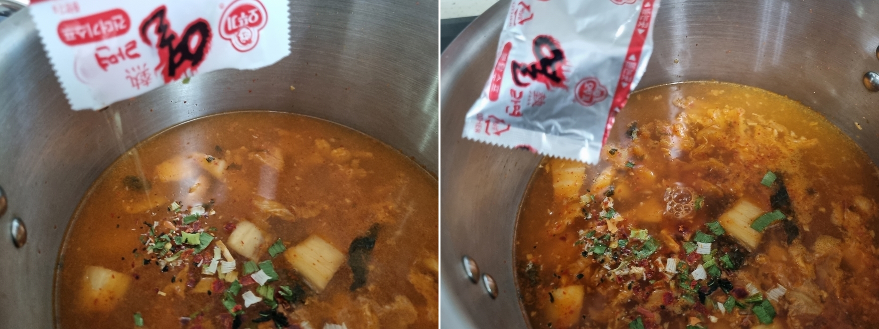 건더기 스프와 분말스프도 같이 넣어주고 물을 끓여줍니다.