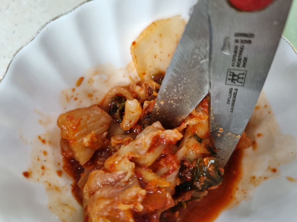 김치를 도마에 올려두고 자르게 되면 도마에 김치 국물 자국이 베겨서 씻기가 힘든데 그릇에 넣고 가위로 자르면 편하기도 하고 김치국물 자국 걱정이 없어요.