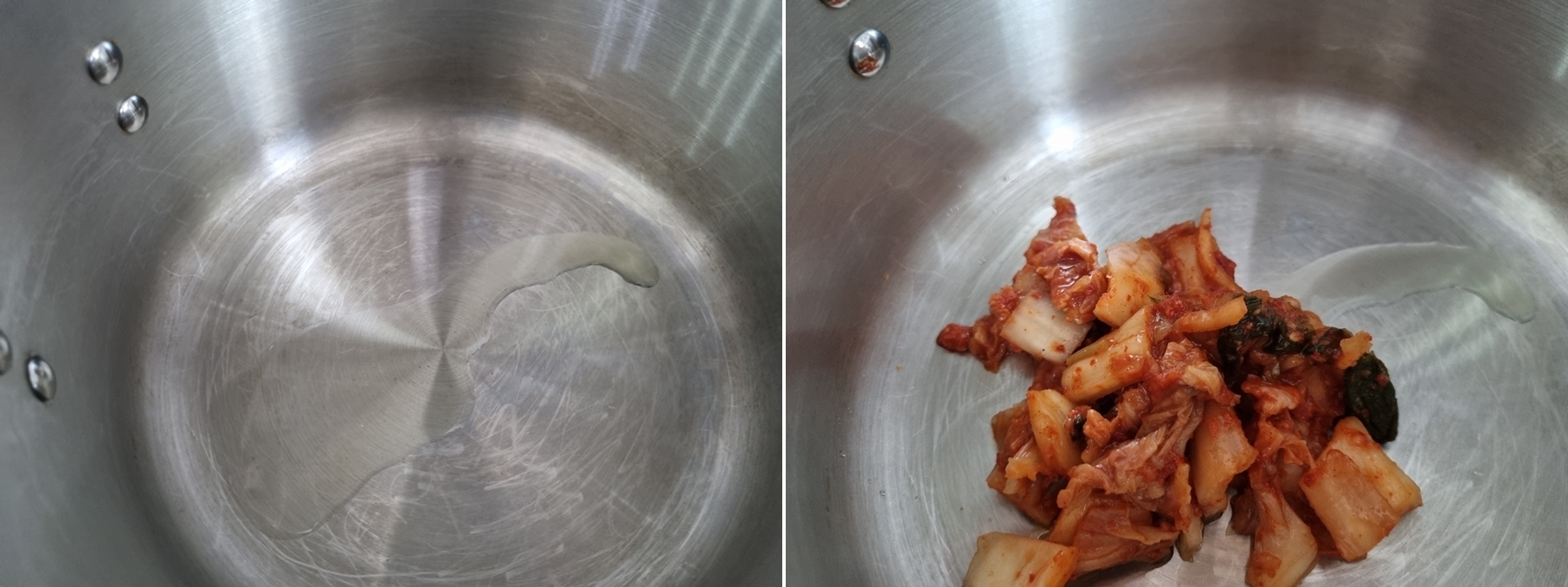 식용유를 김치가 볶일 정도의 양을 냄비에 두르고 김치와 다진 마늘을 넣고 볶아주기 시작합니다.