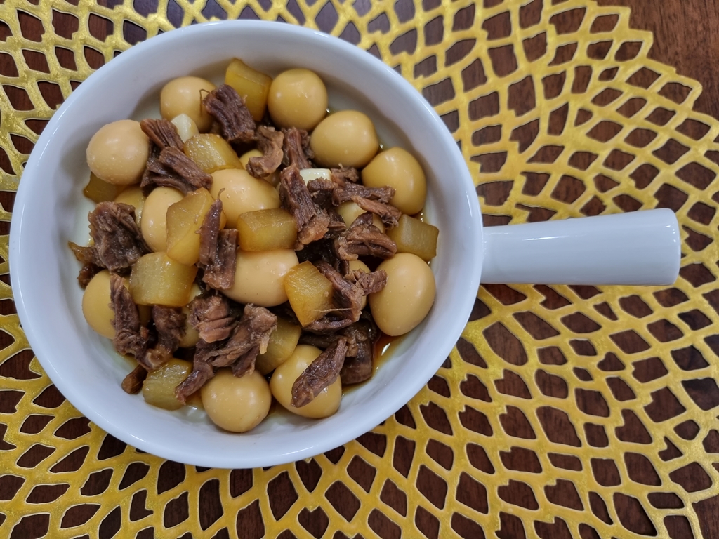 잘게 찢으놓은 사태고기와 메추리알, 깍두썰기한 무우를 넣고 조리기 강불에서 조리기 시작하면 됩니다.