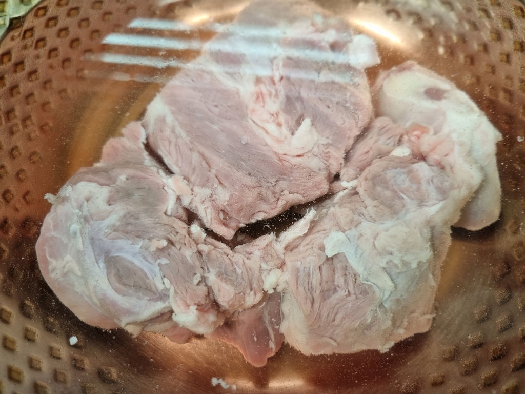 사태육은 300g 입니다. 1시간 정도 물에 담가 핏물을 빼줬더니 핏물과 기름이 빠지네요.