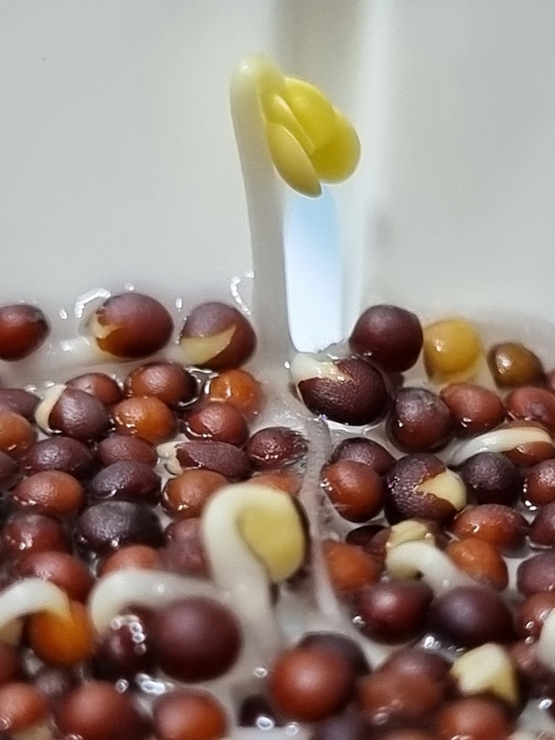 3일째부터 노란 떡잎이 짠~ 하고 고개를 빼꼼히 내밀기 시작합니다. 떡잎이 콩나물 같이 생겼네요.