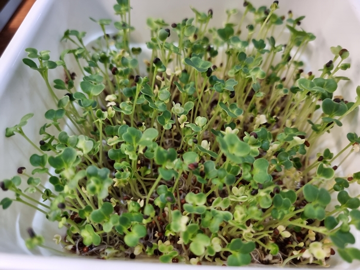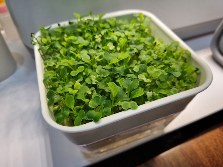 물만 갈아주면서 20일만에 수확해 먹을 수 있는 새싹 채소라서 집에서도 손쉽게 기를 수 있네요.