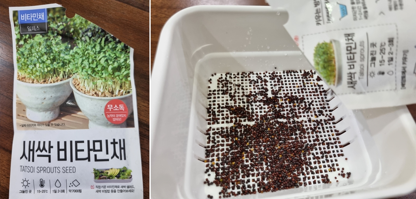 화분과 같이 구매한 잎채소인 새싹비타민채입니다. 씨앗포트위에 씨앗을 솔~솔~ 뿌려봅니다.