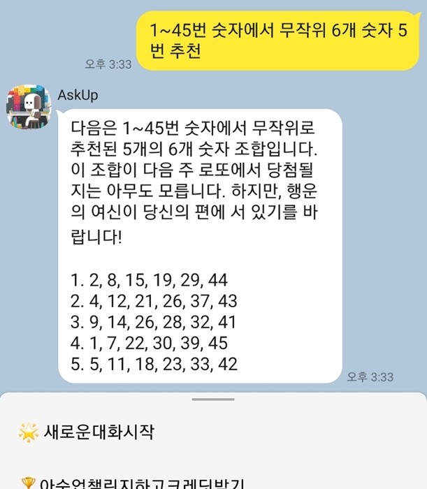 날이 갈수록 똑똑해지고 있는 챗gpt와 아숙업에게 로또 번호를 물어보았습니다.