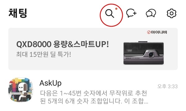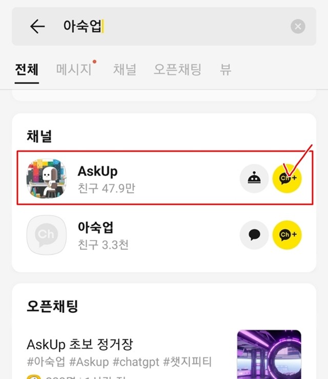 아숙업은 카카오톡 채팅창 상단에 있는 돋보기에 아숙업 또는 Askup이라고 검색하면 채널을 찾을 수 있습니다.