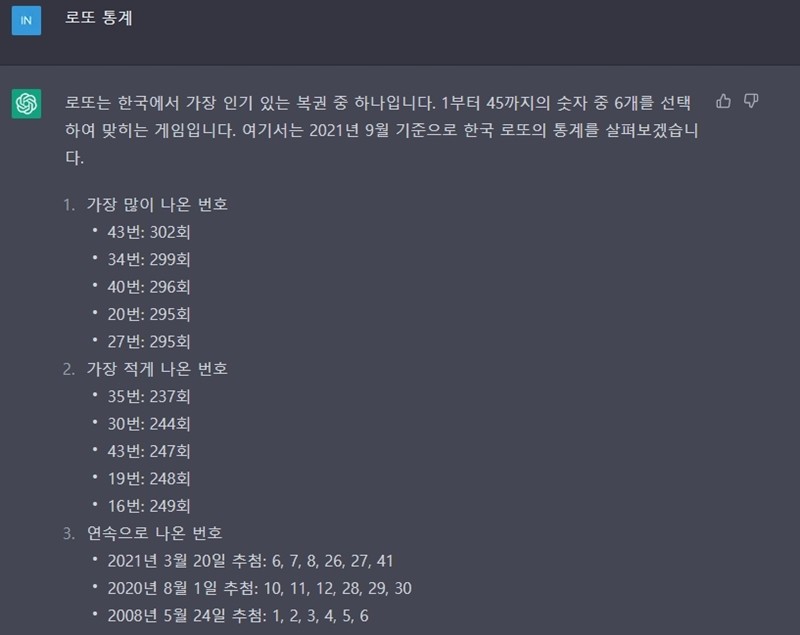 먼저 챗 gpt에게 로또 통계부터 물어 보았습니다. 챗 gpt의 통계 데이터가 2021년 9월입니다.