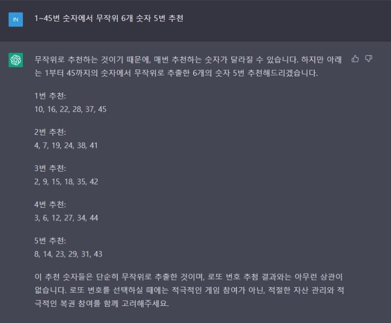 다시 챗 gpt에게 1~45번 숫자에서 무작위 6개 숫자 5번 추천이라고 해봅니다.