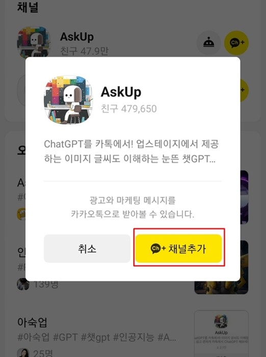 다시 한번 추가 버튼을 클릭하면 아숙업 채널 추가가 됩니다.