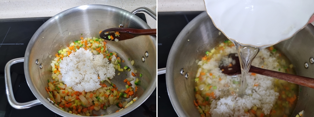 밥 1공기를 넣고, 물은 공기밥 밥그릇으로 가득 2번 넣어주세요. 대략 500ml 나오더라구요. 따로 육수를 사용하셔도 됩니다.