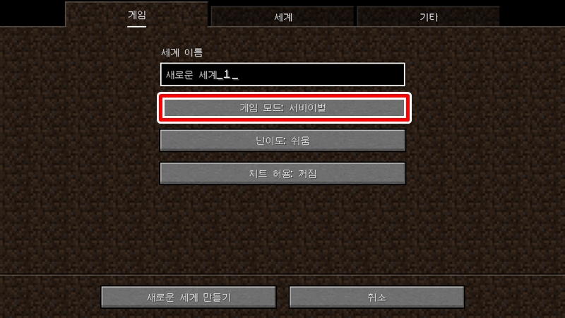 생존을 하기 위해서 게임모드를 서바이벌로 하고 게임 난이도는 평화로움, 쉬움, 보통, 어려움까지 4단계가 있는데 적당한 긴장감과 아직 제작법이 익숙치 않은 관계로 난이도를 쉬움으로 선택했어요. 밤이 되면 나타나는 몹들에게 죽다보니 제작법이 익숙해지면 보통, 어려움으로 넘어갈려구요