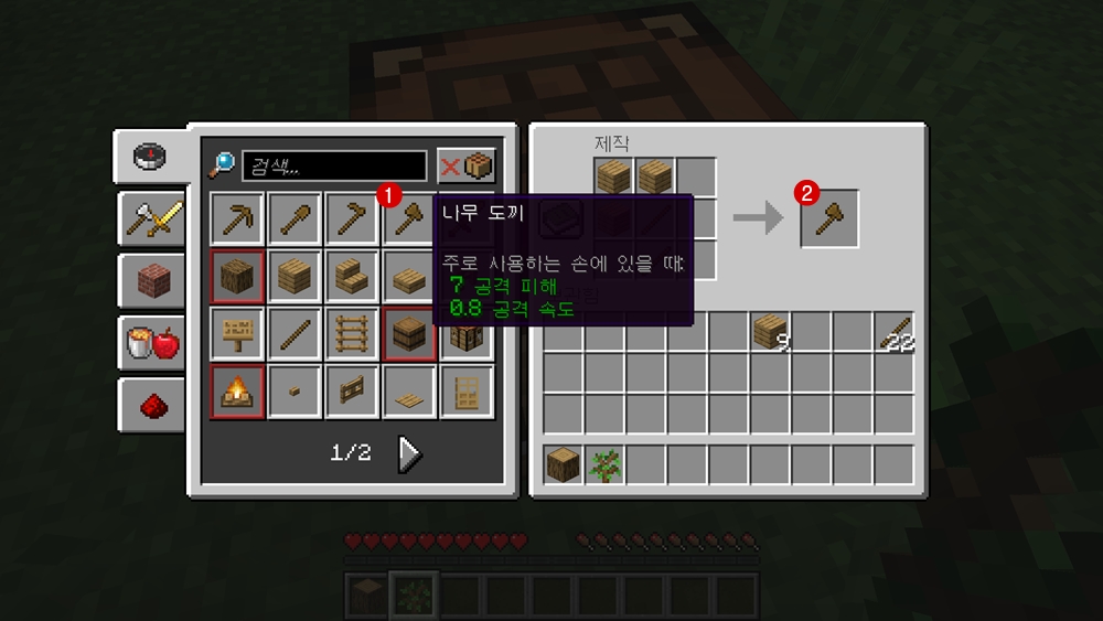 제작대를 마우스 오른쪽 클릭하면 내가 가진 재료들로 만들 수 있는 도구들이 나타납니다.