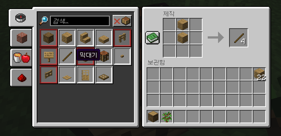 나무 막대기가 있어야 나무검, 곡괭이, 도끼, 삽, 괭이를 만들 수 있으니 넉넉하게 만들어 주세요.