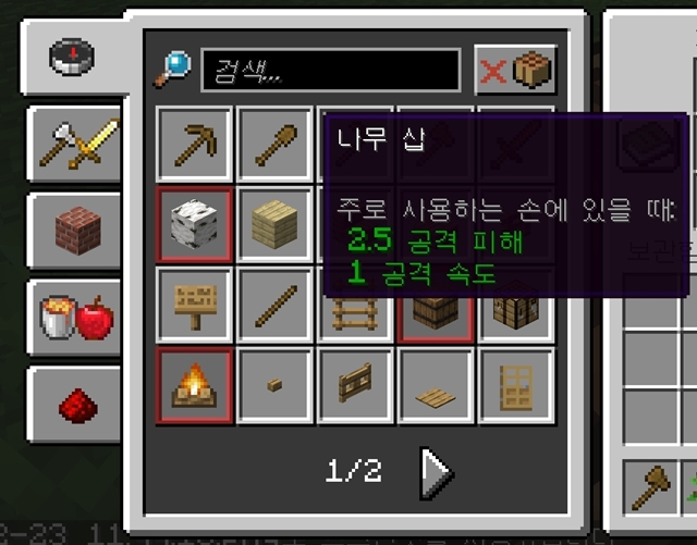 막대기를 만들고 다시 제작대를 클릭해 보니 만들 수 있는 아이템들이 늘어났네요.