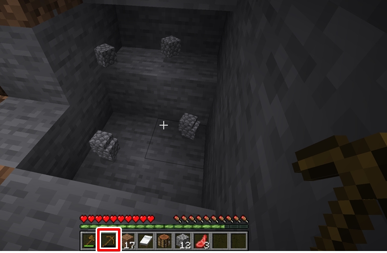 돌도구를 만들기 위해서는 조약돌이 필요합니다. 회색으로 된 블럭을 나무 곡괭이로 부수면 조약돌을 구할 수 있어요.
