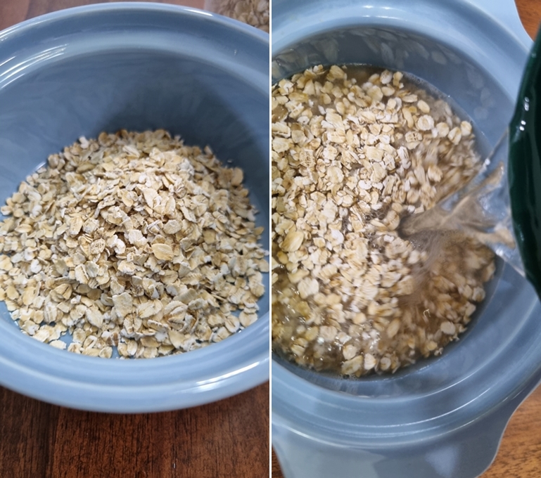 전자레인지용 그릇에 오트밀 5스푼을 담고 물 200ml를 부어주세요.