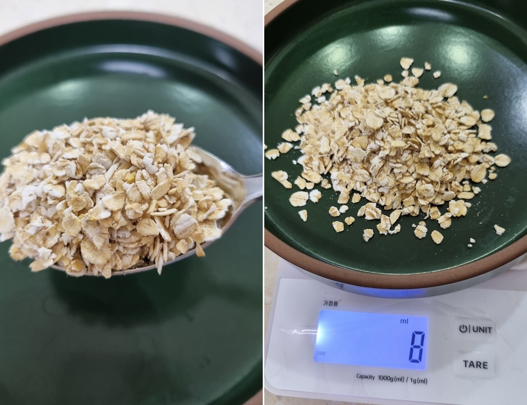 일반적인 밥숟가락 한스푼 기준 대략 7~8g 나오네요. 계란을 추가할 예정이라 5스푼 넣겠습니다.
