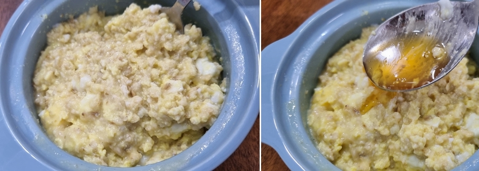 노란자가 안터지게 포크로 계란 노란자를 콕~콕~ 찔러줍니다.