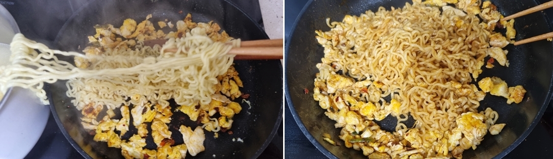 마지막으로 덜 익은 면을 후라이팬에 넣어서 짜파게티 조리하듯이 휘적~ 휘적~ 섞어주세요.