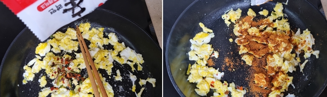 계란을 2개 넣어보니 기름양이 모자라더라구요. 2개 넣으실꺼면 식용유를 3큰술 이상 둘러주세요.