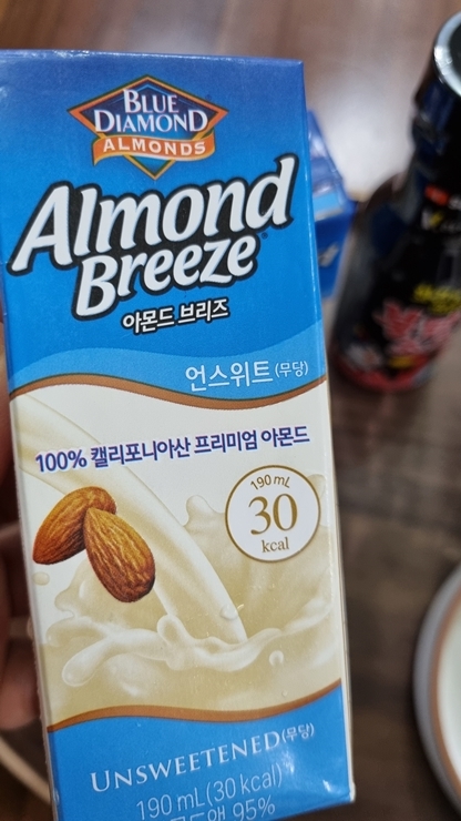 제가 다이어트 할때 마시고 있는 아몬드 브리즈입니다. 언스위트로 칼로리가 30kal 밖에 안되요.