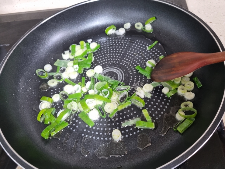 중불에서 식용유를 한바퀴 두루고 파를 살살 볶아주면서 파 기름을 내줍니다.