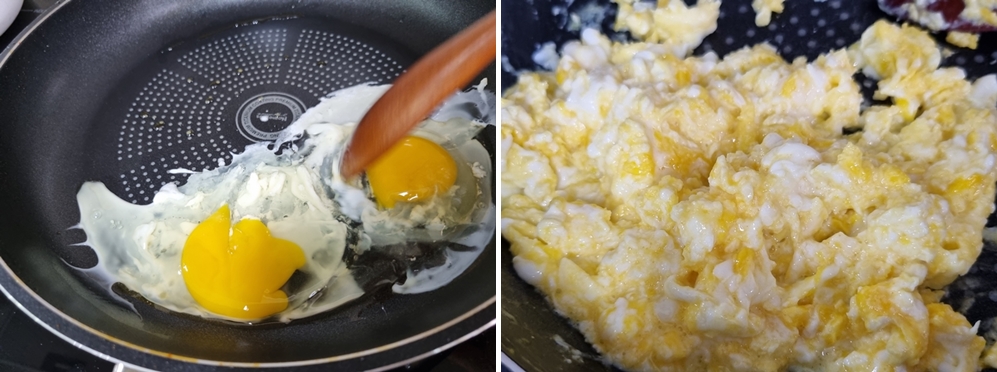 계란후라이가 아닌 스크럼블 에그를 만듭니다. 중불에서 계란을 넣고 바로 휘저어서 스크럼블 에그를 만들어 주세요.