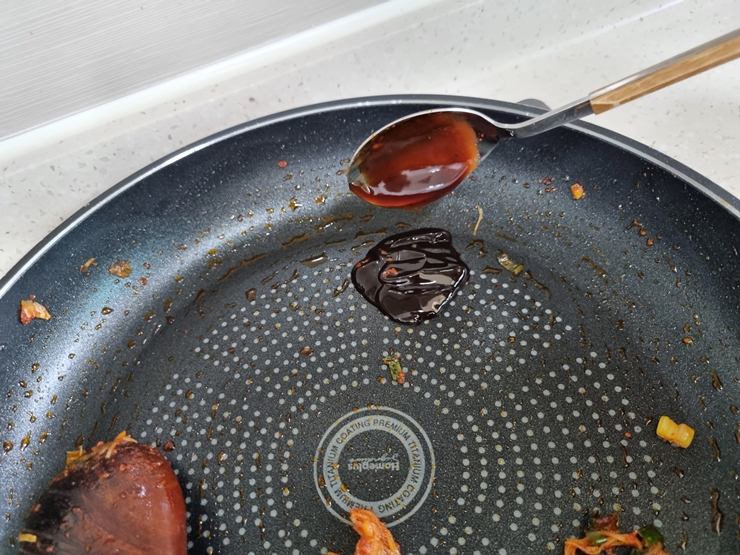 이제 불을 중불로 켜고 굴소스 1스푼을 넣어주세요. 전체적인 간을 굴소스로 맞춰주기에 취향에 따라서 줄여주셔도 됩니다.