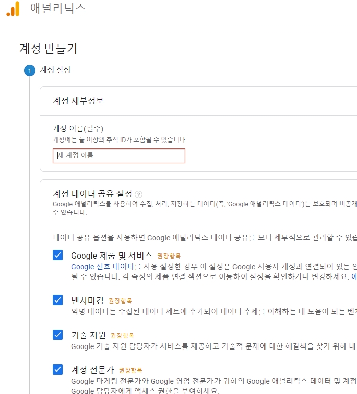 계정 설정에서 구글애널리틱스의 사용 계정을 만들어 주어야합니다. 계정 이름은 사용하는 블로그 이름을 작성하셔도