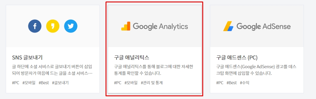 이 추적ID와 gtag.js 태그를 티스토리에 연결해주면 작업이 끝나게 됩니다. 티스토리 플러그인에서 구글 애널리틱스를 클릭해줍니다.