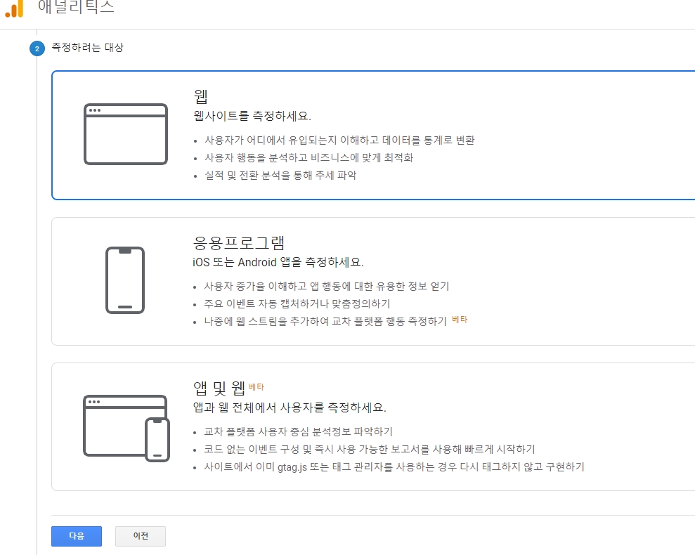 측정 대상 옵션에는 웹, 응용프로그램, 앱 및 웹이 있습니다. 앱 및 웹은 베타버전이라 웹을 선택했습니다.