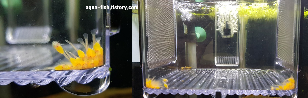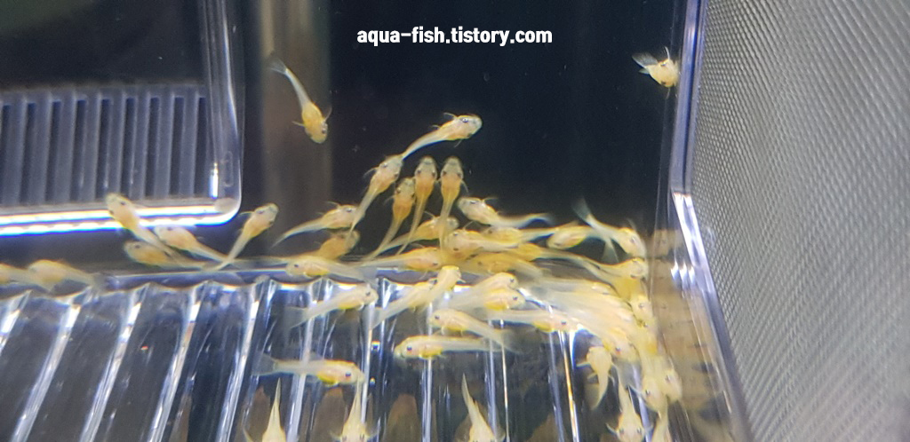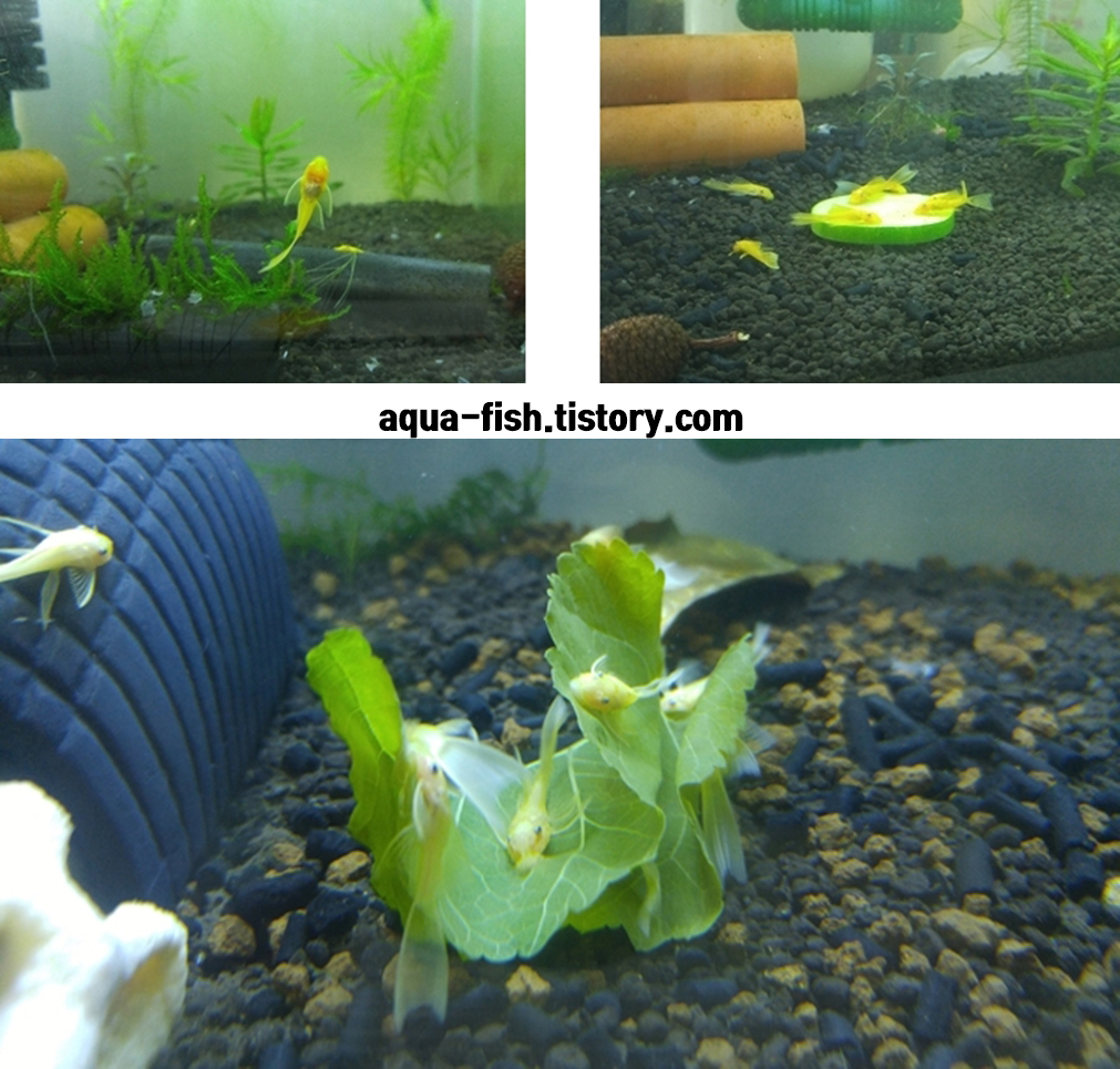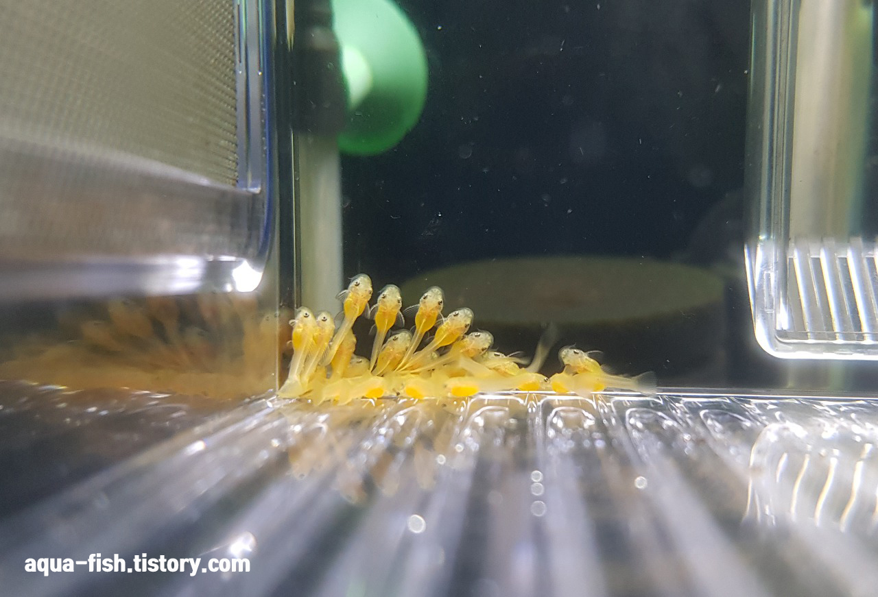 5~6일차 접어들면 서서히 흩어지면서 먹이 찾는 모습을 볼 수 있습니다. 처음에는 브라인 쉬림프로 급여해주다가 치어항을 따로 만들어서 시금치를 급여해줬네요. 이때부터 탈락이 생기기 시작하더라구요.