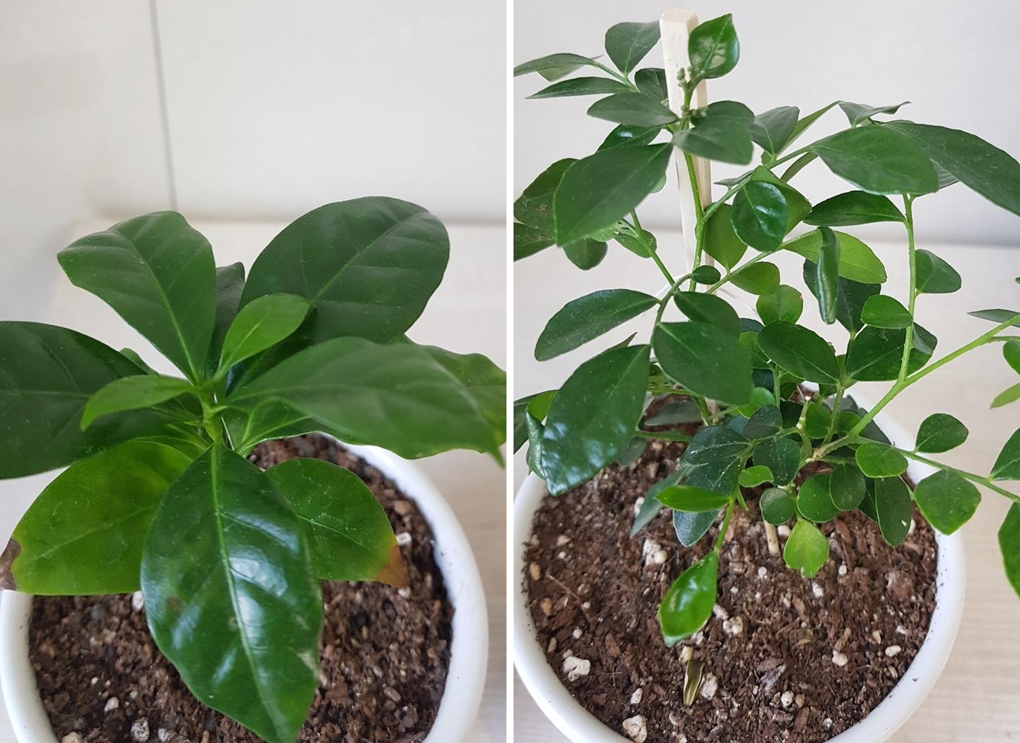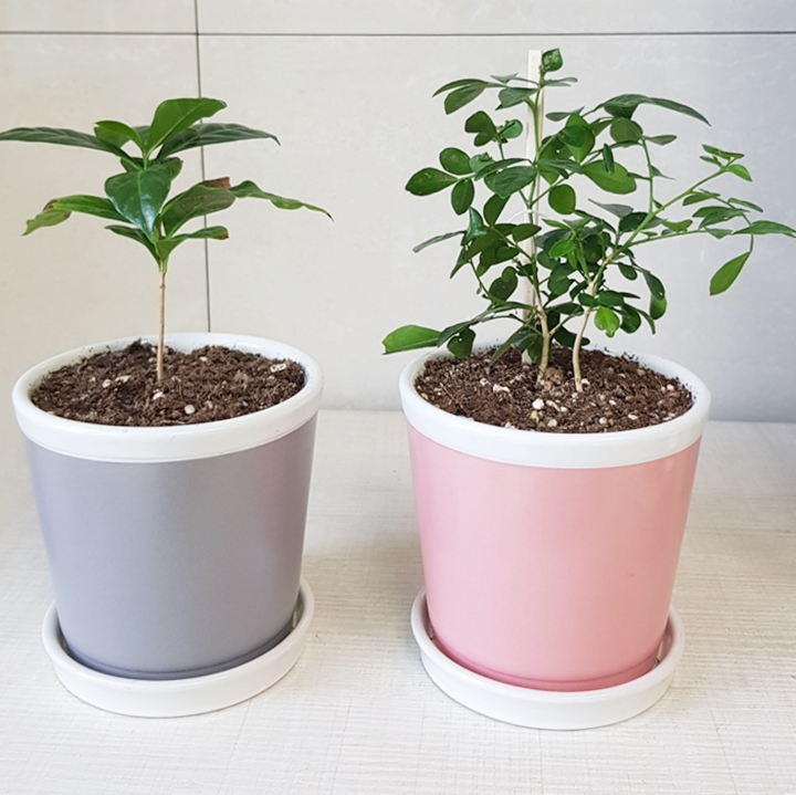 왼쪽 회색 화분 나무는 커피나무에요. 아마도 아라비카원두 나무 같은데 좀 더 키워봐야 될 것 같아요.