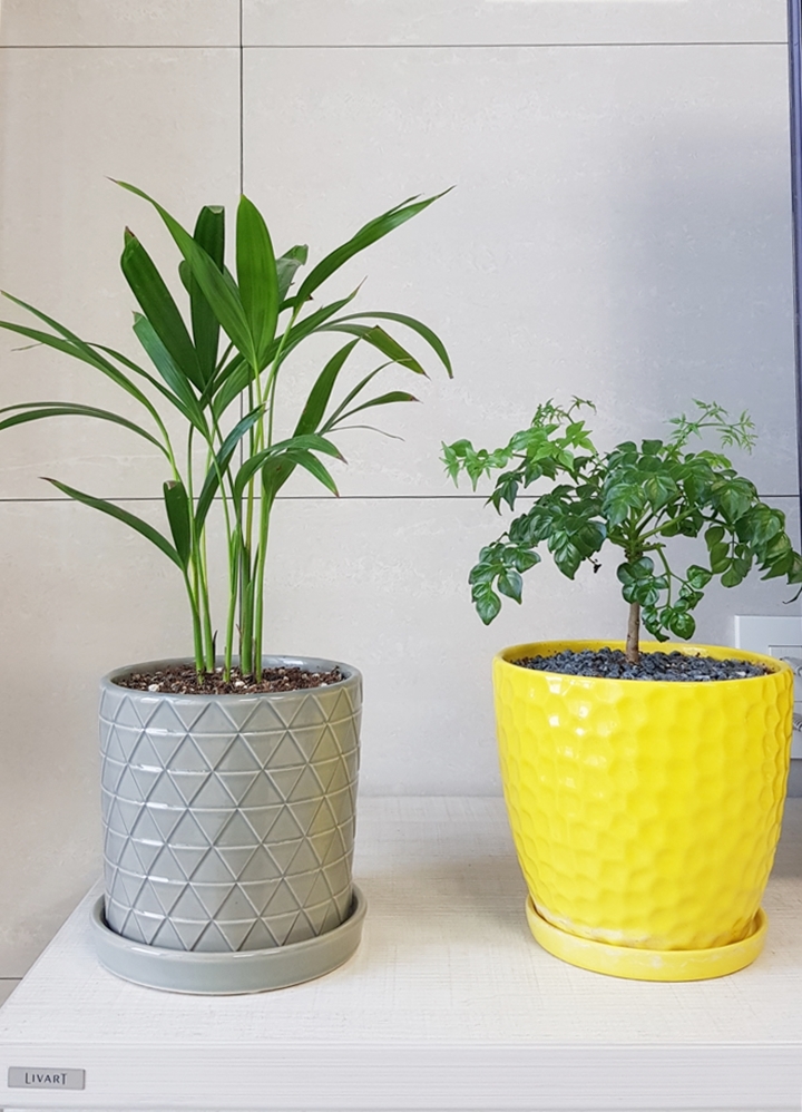 왼쪽 회색 화분의 식물은 공기정화능력이 뛰어난 아레카 야자이고 오른쪽 노란색 화분은 꼬꼬마 나무때부터 열심히 키우고 있는 해피트리 나무에요.