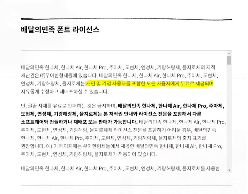 배달의 민족 폰트 라이선스입니다. 글꼴 자체를 돈을 받고 파는것 외에는 개인 및 기업 사용자에게 무료로 제공되는 폰트입니다.