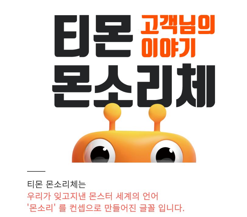 티몬 전용 글꼴 2종을 무료로 다운받아 보세요. (딩벳버전 업데이트) | 1. 티몬이 드리는 첫 번째 선물 : 티몬 몬소리체 티몬 몬소리체는 우리가 잊고지낸 몬스터 세계의 언어 '몬소리' 를 컨셉으로 만들어진 글꼴 입니다. ‘맘마무이잇이음냐음냐음읗’ 이게 몬소리? 이 귀여운 아기들이 내는 소리는 사실, 티모니의 언어, 몬소리입니다. 몬소리 이야기 동영상 보기 어른이 된 우리는 커가면서 몬소리를 잊었지만, 지치고 힘들 때,